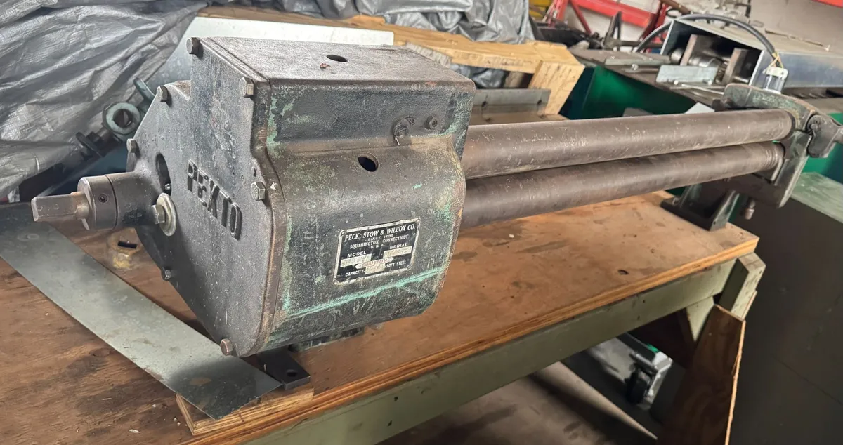 This Roper Whitney MODEL 390E 3′ X 16 GAUGE MANUAL SLIPROLLS is on a customer made wooden bench. We can remove from stand if not wanted. This manual roll has 2 1/2″ precision turned and ground high carbon steel rollers. There are four wiring grooves 1/4″, 9/32″, 5/16″ and 3/8″. All rolls are standard wih fully enclosed gear housings and all three rolls are driven. The upper roll lifts for conventional removal of the work piece. The maximum sheet length is 36″ with a thickness capacity of 16-18 gauge mild steel.