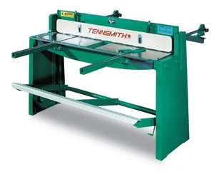 Tennsmith shears have the most complete adjustment features of any sheet metal shear on the market. The lower shear blade is bed adjusting and the upper blade is adjustable by means of a truss bar on the cutter head. The spring-activated hold-down feet clamp the work piece securely in place and are easily adjustable to compensate holding pressure for light or heavy gauge material. There is ample clearance between the hold-down feet and shear blades to allow good operator vision for line-of-sight cutting. The standard, double-locking back gauge, which features embossed scales and vernier wheels for fine adjustment, gives highly accurate readings.