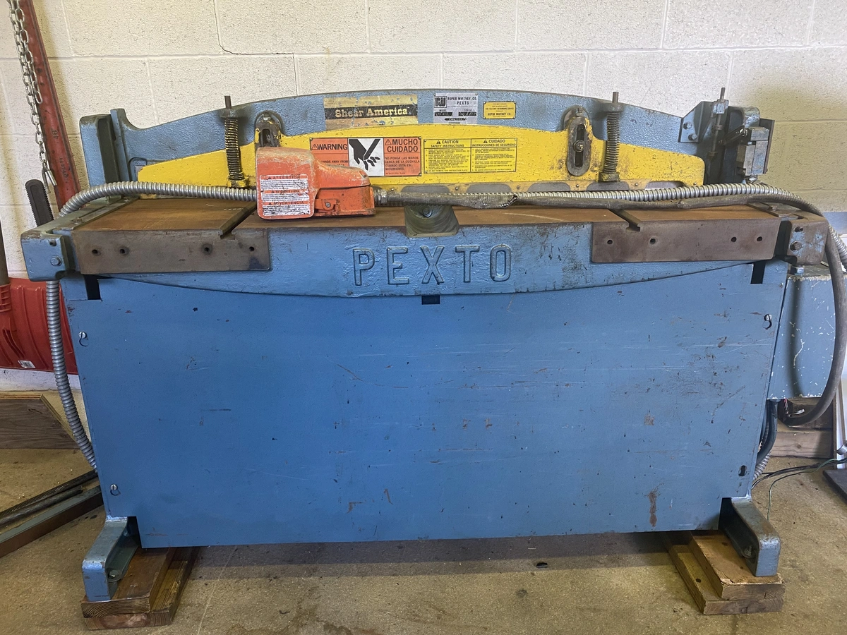 Pexto’s PH-452 features compact, fully-integrated, hydraulically powered units that are ideal for many light gauge shearing applications. Pexto hydraulic power shears feature fast, smooth, oil-cushioned action. Both moving and fixed blades are shearing blades of Hi-Speed steel. One piece cast shear bed is recessed for easy sheet handling. Standard equipment includes a precision rack and pinion back gauge a solid finger guard. The PH-452 also includes front and side gauges, bevel gauges and two front arms. The bed is machined for optional side extension squaring gauge.