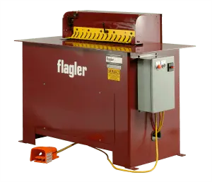 The Flagler Hybrid Cleatfolder machine is for forming a 7/16”-1/2” cleat edge 20 ga. max. Open throat design equipped with overload shear pin, guard safety switch, armor plated back-gauge inserts. Hybrid models feature a Pneumatic Clamping Table and a 2 Horsepower Motor that is wired for 230-Volt 3-Phase with an Amp Pull of 6.