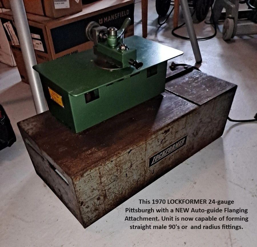This listing is ONLY to show how we can take a 1970 OLD Lockformer 24-gauge Pittsburgh and add a NEW 2024 Auto-guide Flanging Attachment to it and make it twice as valuable and productive. Take a look at the before and after photo. It takes less than 15 minutes to install, and we are offering FRE FREIGHT at our discounted price IF YOU MENTION THIS STOCK NUMBER. Thank you! 800-753-0393 to order or email.