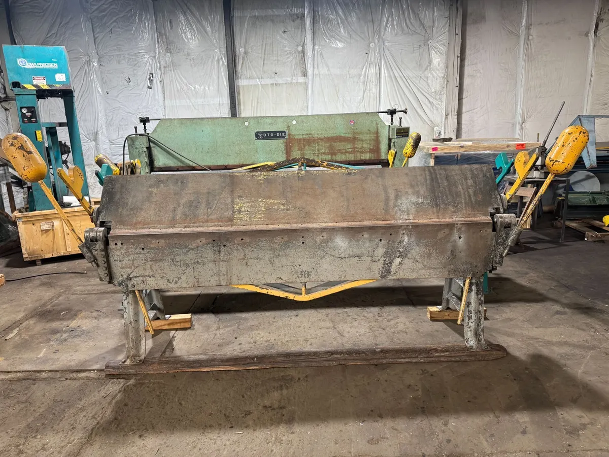 The Chicago 814 Hand Brake is a classic manual brake known for its durability and efficiency. It has a bending length of 96 inches and a capacity of 14 gauge for mild steel and 18 gauge for stainless steel. The weight of the hand brake is approximately 3,100 lb. The nosebar on this brake is in really nice shape and has no nicks in it.