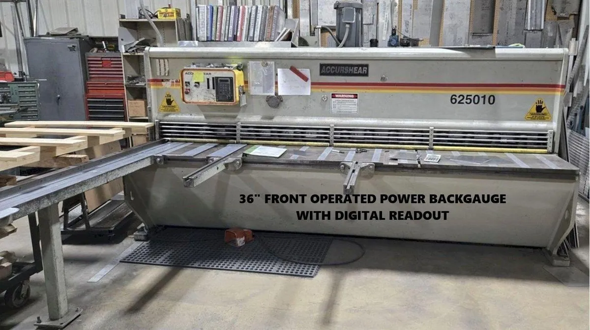 This is a Accurshear 625010 10′ x 1/4″ Hydraulic Shear w/ Front Operated Backgage