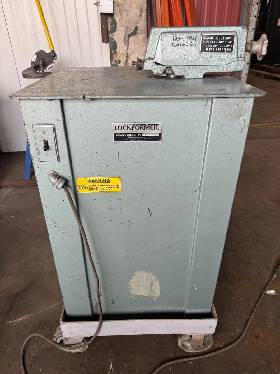 This is a USED but nearly new 16-gauge Power Flanger. It's equipped with the convenient table slot to turn up a "starting flange"! A calibrated dial can be set for radii as small as 3-1/4" (or 2"when auto-guide is deactivated). Automatically flange 16 to 26 gauge material at speeds of 18 fpm. A non-releasing type head is suitable for open-end fittings, straight and irregular curves. Machine is wired 110-Volt 1-Phase.