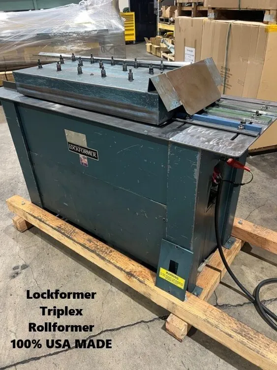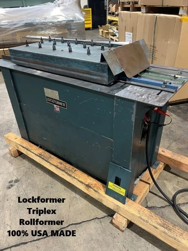 This Lockformer Triplex Cleatformer has 9 forming stations with two (2) inboard forming position for the Flat “S” Cleat and Drive Cleat as well as two (2) outboard stations equipped with MALE and FEMALE SNAPLOCK ROLLS. It is a stand-alone machine that has a 5 HP Motor and runs on 230 Volt, Three Phase Power with 100 FPM running speed. This machine is ready to ship, wire up and run parts upon delivery. Call us to order at 800-753-0393